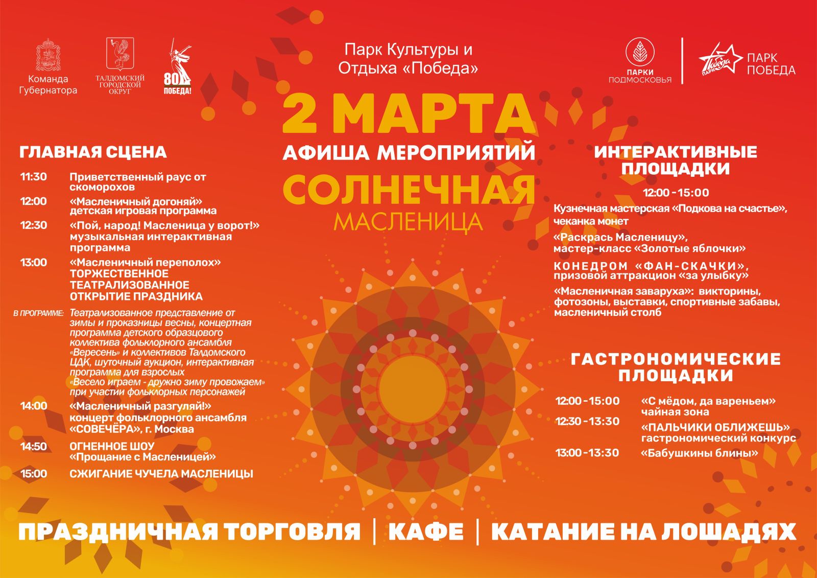 Дорогие Друзья! Приглашаем Вас 2 марта с 11:00 до 15:00 в парк культуры и отдыха "Победа", по адресу: г.Талдом, ул. Победы, на праздничное мероприятие "Солнечная масленица".